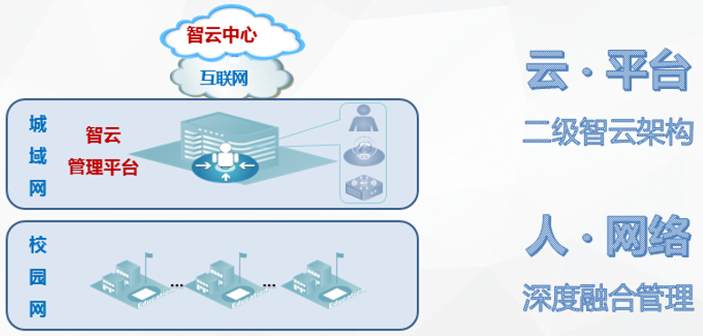 智云管理平台:部署在无线城域骨干网(一般指教育局机房)中,作为城域网统一管理平台,能够将人&网络统一管控,同时与智云中心业务承接相关云业务。