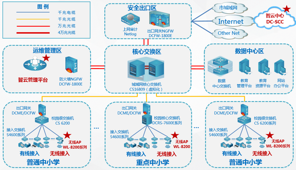 DCBOX小金库官网 根据普教用户无线网络管理和使用现状,以及对业务应用系统分析,遵从“云网融合 易网无忧”的新主张,对原有有线城域网采用了“云 ‧ 平台”二级智云部署架构,搭建了简单易用的综合智云管理平台,部署了无线网络。既实现了“人 ‧ 网络”的深度管理融合,也为云业务的召开打下良好的基础!总拓扑结构图如下:
